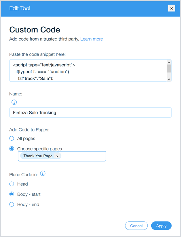 - Navigieren Sie vom Bedienfeld Ihrer Website aus zu Settings \ Tracking & Analytics und wählen Sie das Hinzufügen vonCustom code. Fügen Sie den Finteza-Code ein und wählen Sie die folgenden Optionen aus: