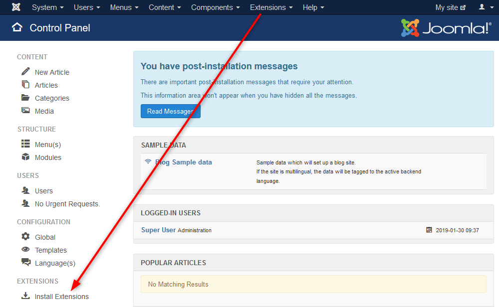 Entre en la página de descarga y baje el plugin para Joomla. En el panel de administración de Joomla, en el apartado Extensions, seleccione el punto del menú Install Extensions.