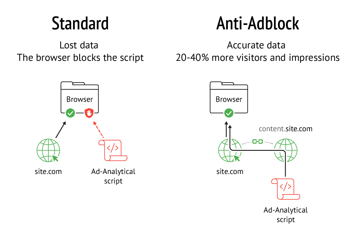 Quando la funzione Anti-Adblock è attiva, il browser dell'utente e tutti i suoi plugin visualizzano il load dello script di monitoraggio come se fosse scaricato dal sottodominio del tuo sito piuttosto che dal server Finteza. In questo caso, non appare come un download di terza parte e non è quindi soggetto al blocco.