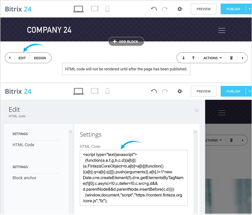 - 새로운 블록의 좌측에서 "Edit"을 클릭하고 "HTML Code" 필트에 Finteza 코드를 붙여넣기 하세요.
