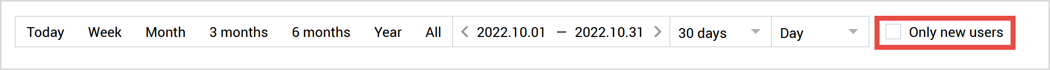 Outra configuração adicionada é a capacidade de selecionar apenas usuários "novos". Isso significa que apenas os usuários cujo primeiro evento inicial calhou no período do relatório serão incluídos no relatório. Lembre-se de que, se você instalou o contador Finteza em seu site há pouco tempo, todos os usuários serão "novos" para análise. Nesse caso, será necessário coletar dados estatisticamente significativos.